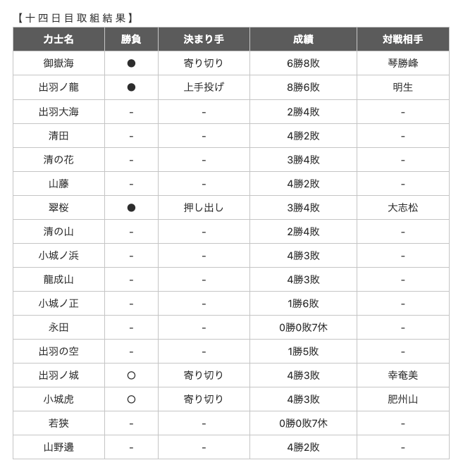 大相撲一月場所取り組み結果 十四日目