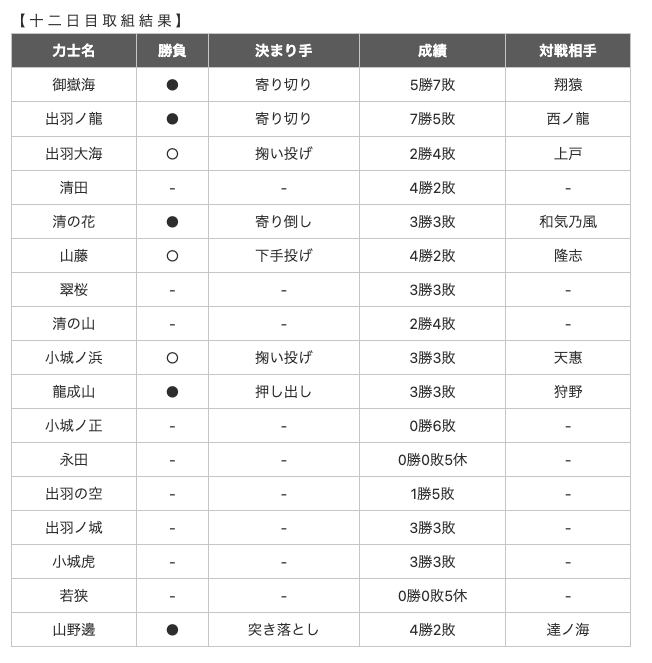 大相撲一月場所取り組み結果 十二日目